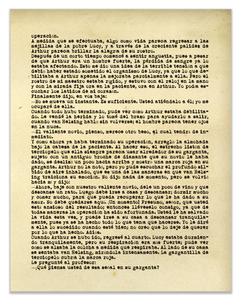 "Señor, ha llegado a tiempo. Usted es el amante de nuestra querida señorita. Ella está mal, muy, muy mal. No, hijo mío, no se vaya así". Pues de repente se puso pálido y se sentó en una silla casi desmayado. "Usted debe ayudarla. Usted puede hacer más que cualquier otro ser vivo, y su valentía es su mejor ayuda".